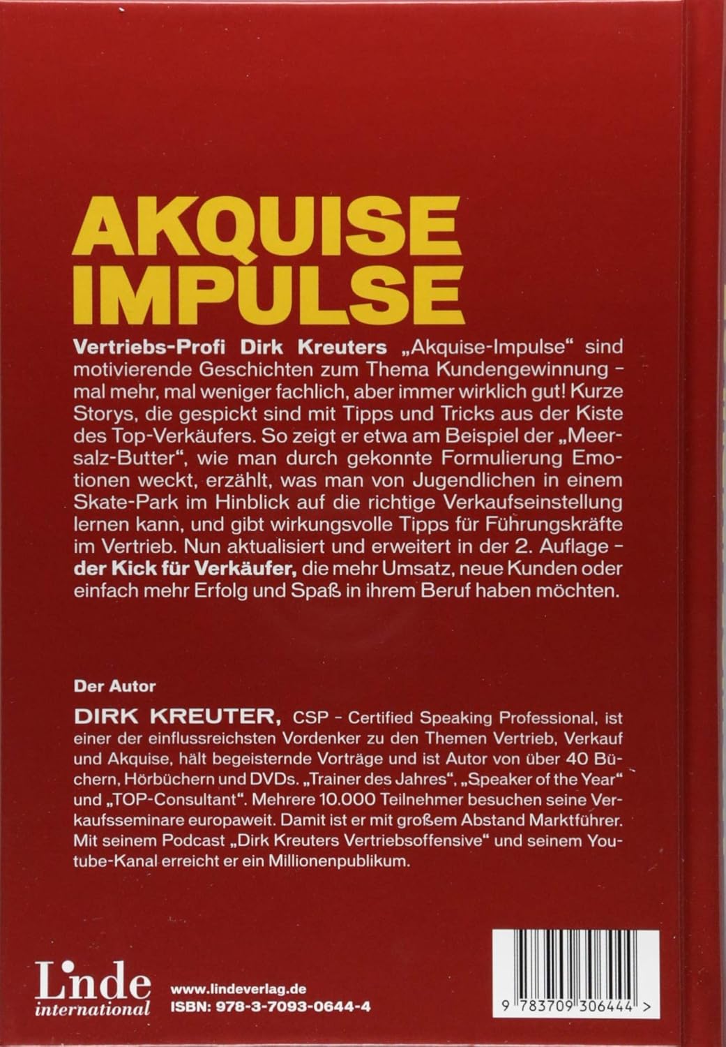Das Buch „Akquise-Impulse: Motivieren – überzeugen – verkaufen“ von Dirk Kreuter ist ein umfassendes Werk, das sich auf die Kunst der Akquise und des Verkaufs konzentriert. Dirk Kreuter, ein renommierter Verkaufstrainer und Speaker, bringt in diesem Buch seine umfangreichen Erfahrungen und Kenntnisse ein, um Verkaufsprofis dabei zu unterstützen, ihre Fähigkeiten im Verkauf und Kundenmanagement zu verbessern.