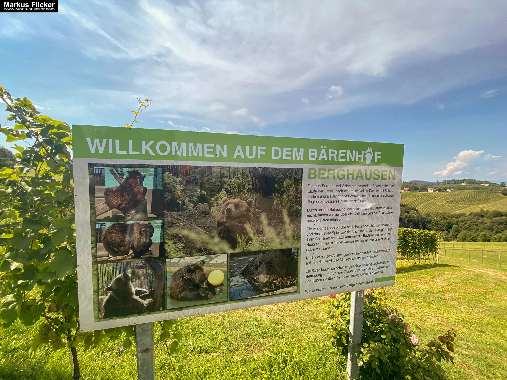 Der Bärenhof Berghausen ist ein privates Projekt an der Südsteirischen Weinstraße. Hier wurden Braunbären, aus Europa und Asien stammend, nach einem leidvollen Dasein aufgenommen und sollen hier ein schöneres Zuhause finden.