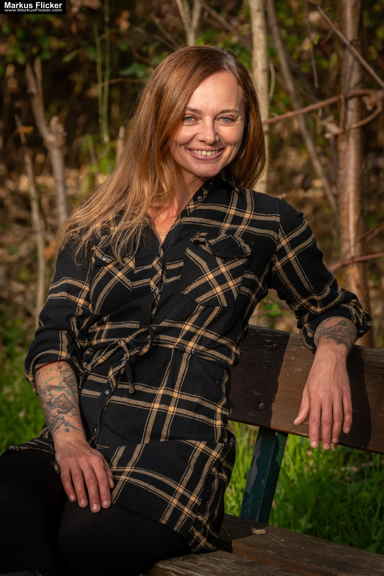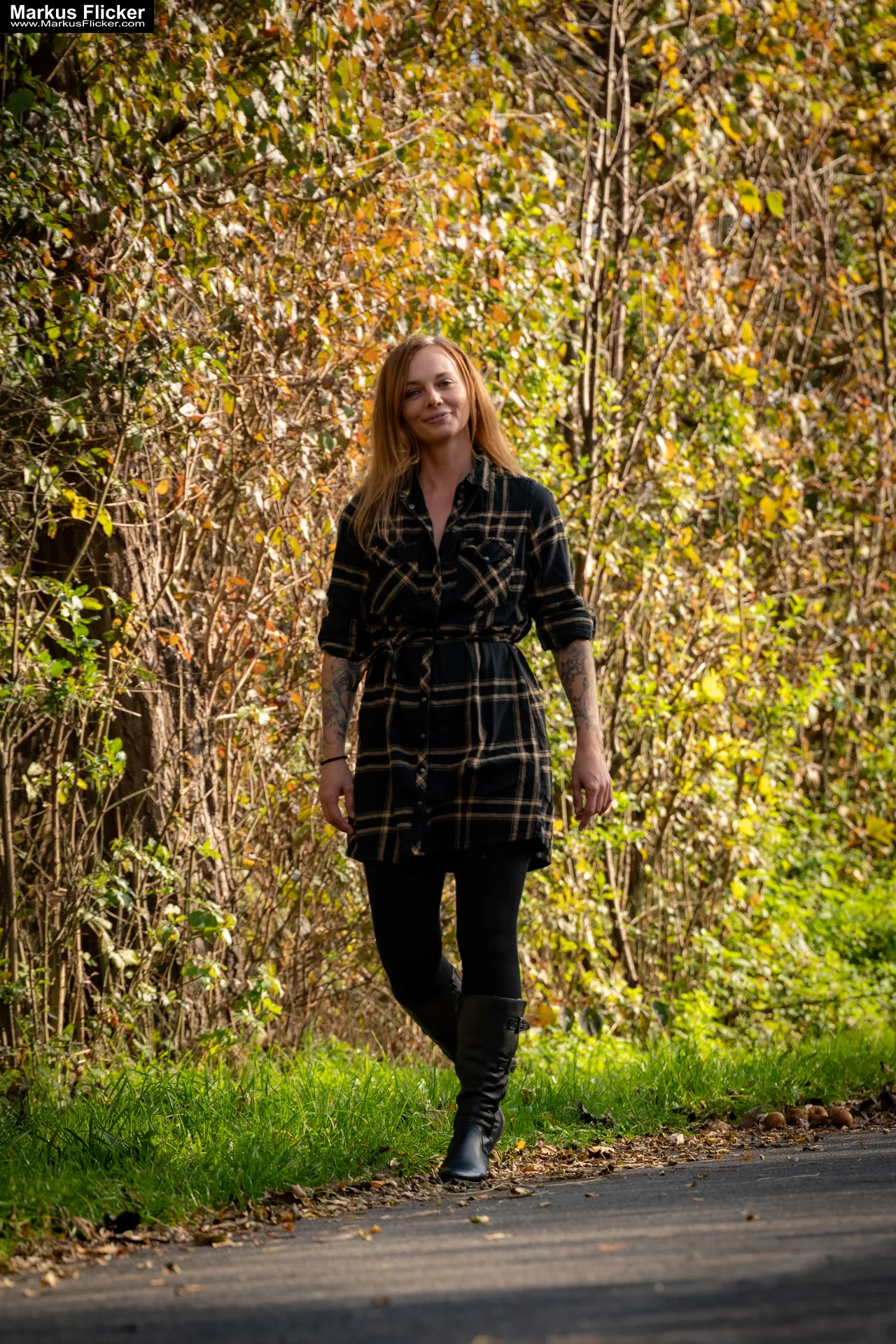 Verwende eine große Blende (z. B. f/1.8 oder f/2.8), um das Model vom Hintergrund zu trennen und das Laub in weiches Bokeh zu verwandeln.