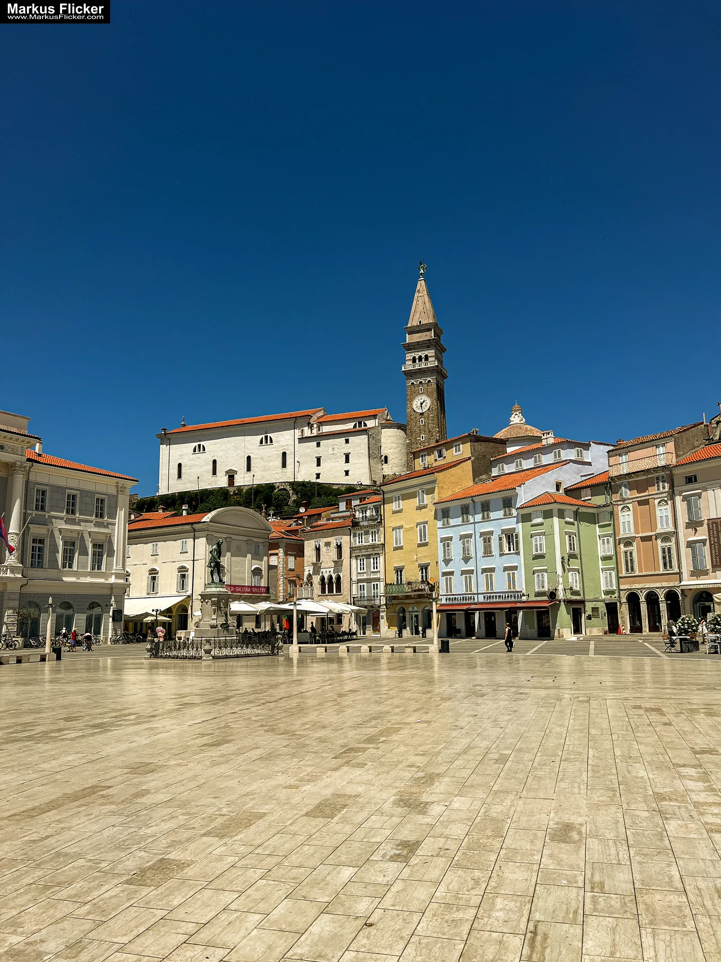 Der zentrale Platz von Piran ist ein idealer Ausgangspunkt für Erkundungstouren. Hier können Besucher die Statue von Giuseppe Tartini bewundern und in einem der vielen Cafés die Atmosphäre genießen.