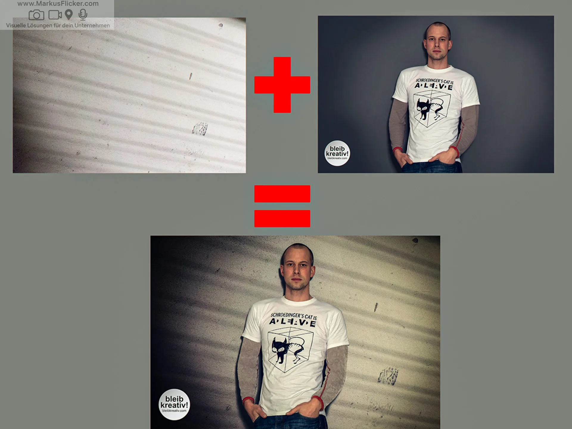 Ebenso wichtig ist Spannung im Bild. Spannung entsteht nicht nur durch Bewegung, sondern auch durch Kontrast. Zum Beispiel zwischen ruhiger Pose und starkem Motiv, zwischen nüchterner Ästhetik und philosophischer Aussage oder zwischen digitalem Kontext und persönlicher Präsenz. Genau solche Kontraste machen Bilder interessant.