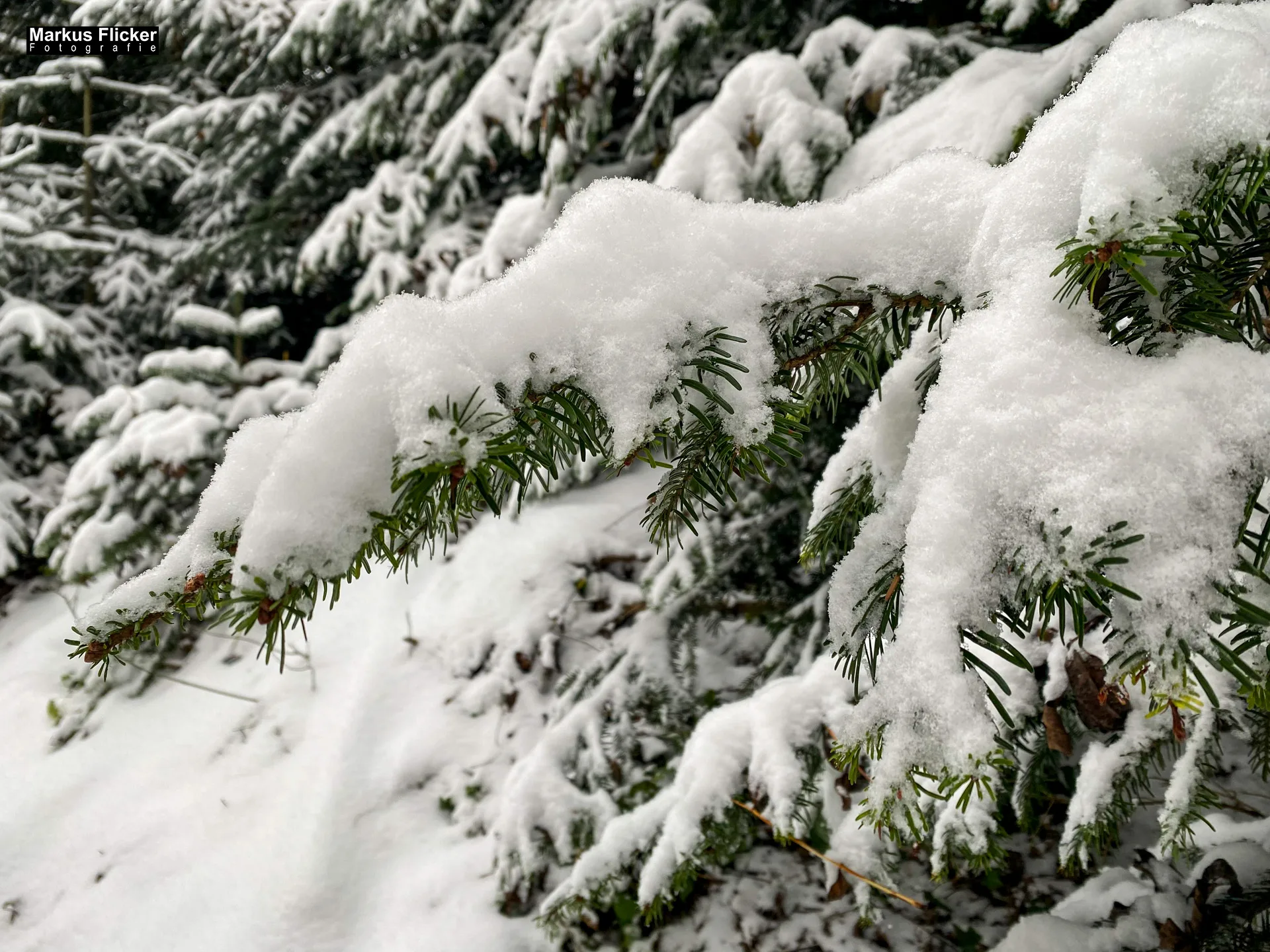 Der Morgen begann mit einem Spaziergang durch einen dichten Wald, dessen Bäume von der frischen Schneelast gebeugt wurden. Das Tageslicht brach durch die Äste und zauberte faszinierende Lichtspiele auf den Boden. Es war der perfekte Moment für einige Detailaufnahmen. Ich konnte die Schneekristalle, die auf den Nadeln der Bäume glitzerten, in ihrer vollen Pracht einfangen. Die Textur des Schnees und die Kontraste im Bild sind einfach magisch.
